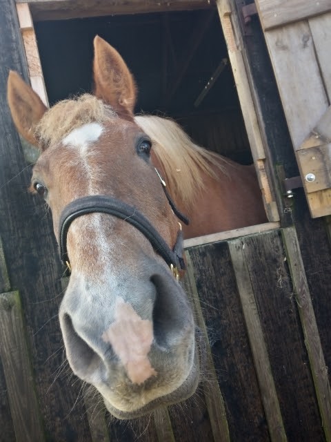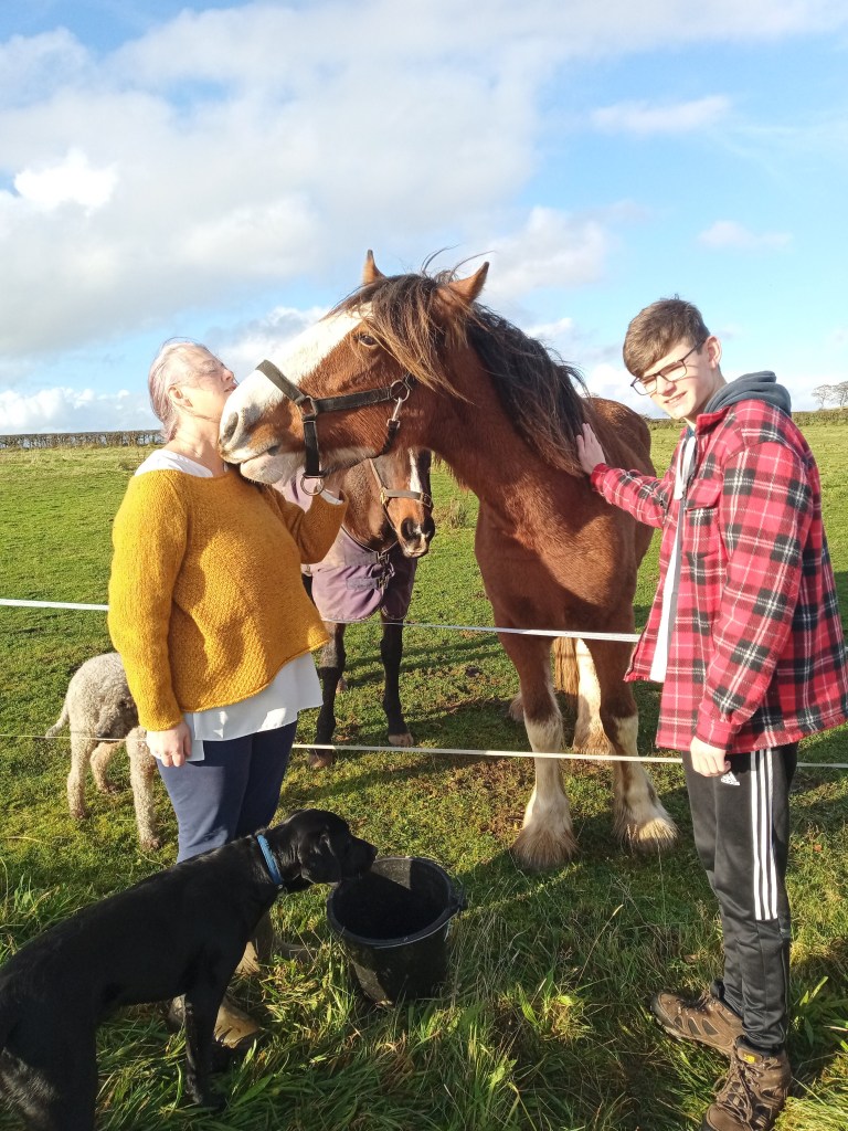 Tim and Dora are getting along well. Dora is a very kissy horse, she also has a mustache, which explains some of the faces the family pull when a giant Clysedale puckers up and gives them a big smackeroo.