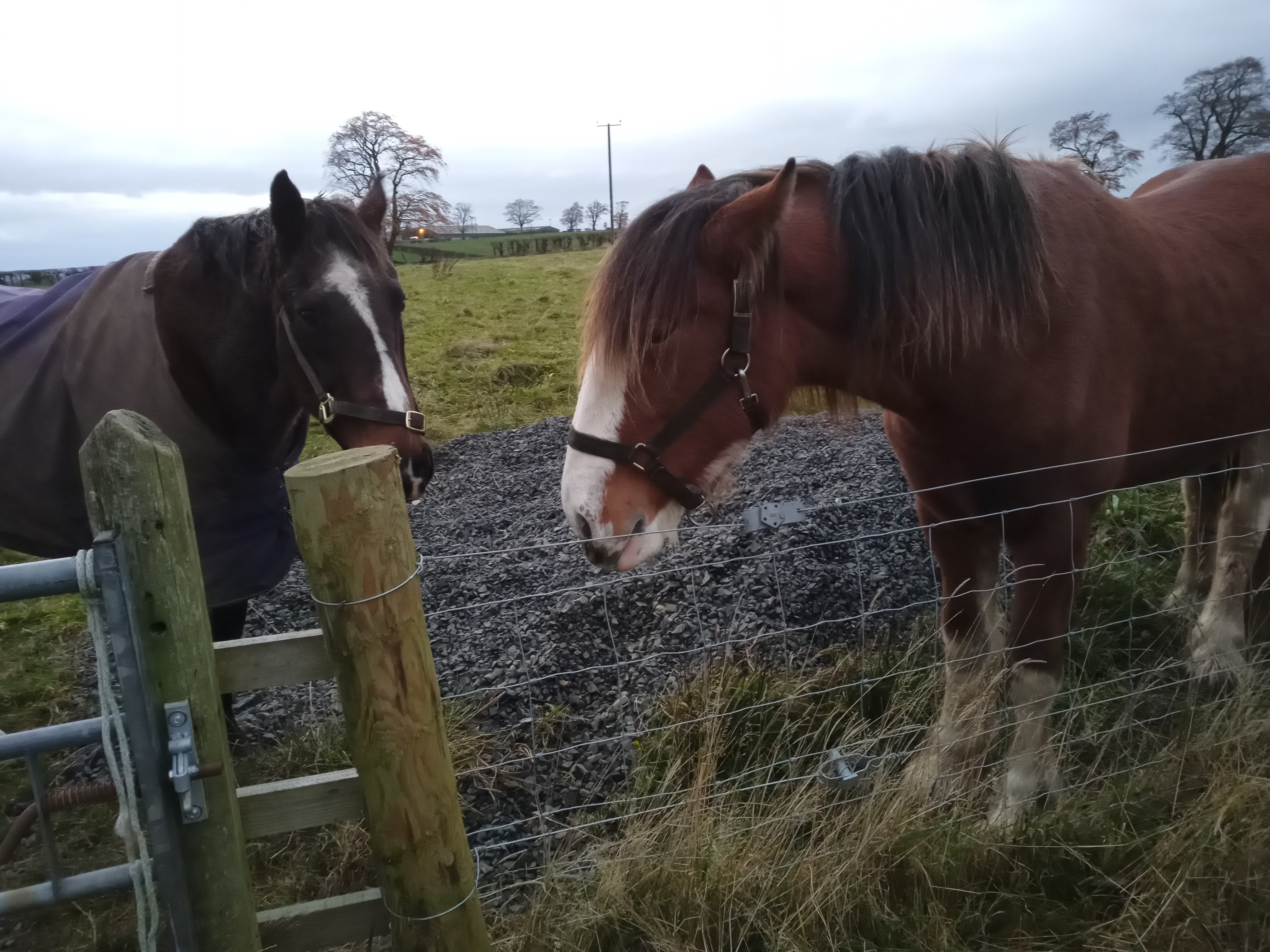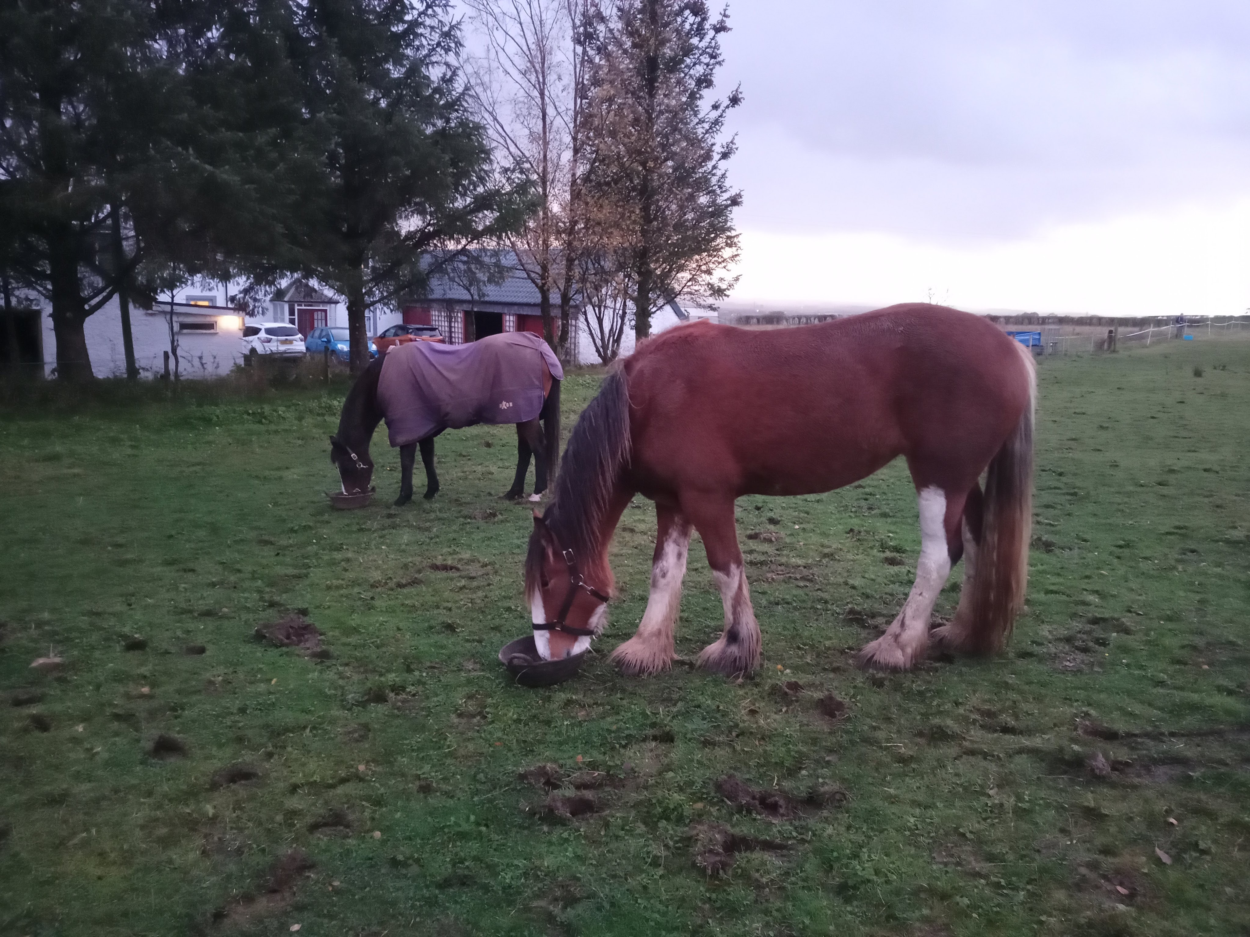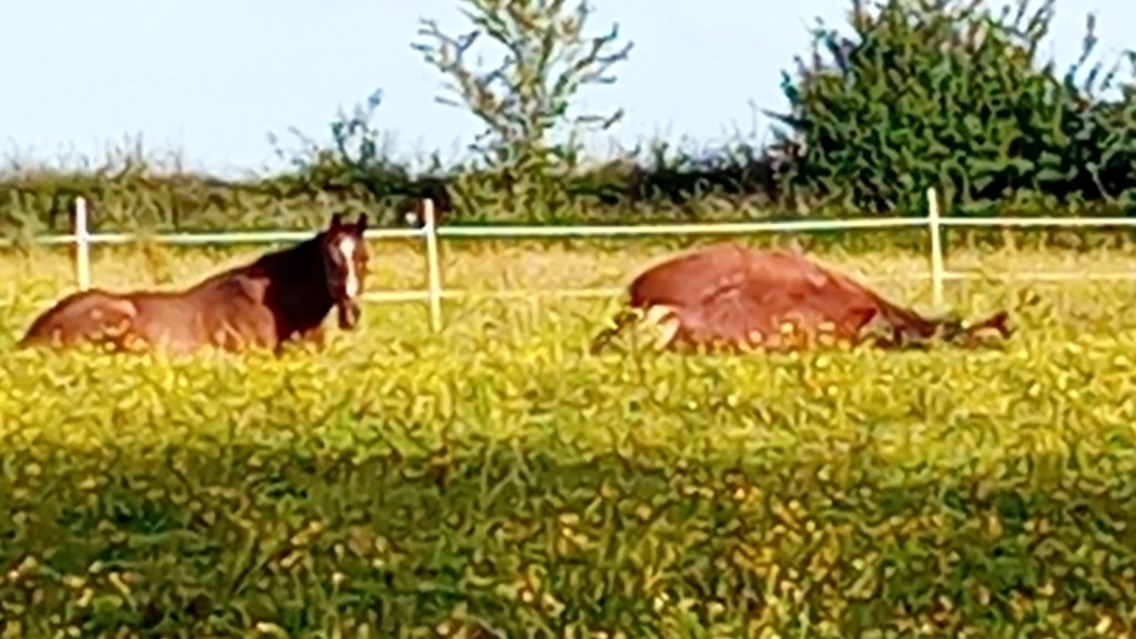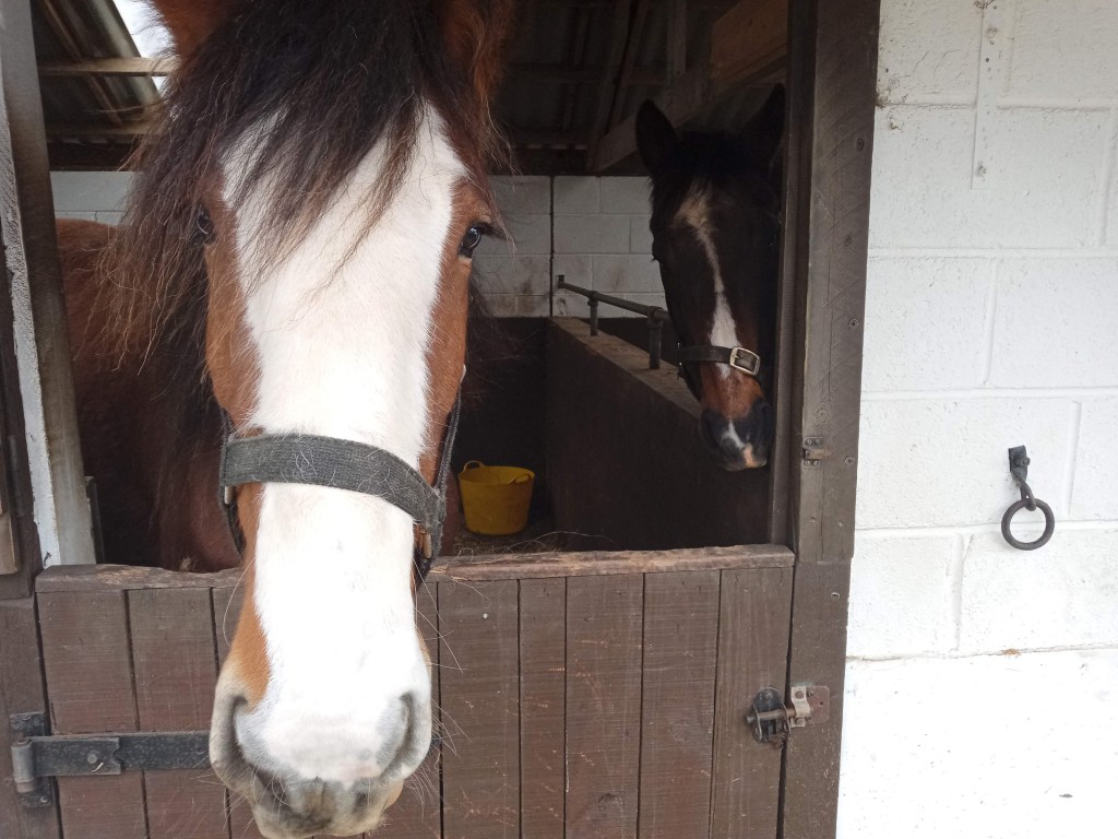 Day 5. I went to give the horses breakfast and was met by an agitated Tim. He had been scratching his head on something and had managed to flip his headcollar over one ear. It was now hanging down across his eye. He obviously thought he had gone blind and was very worried. So worried that he wouldn’t let me near him to fix it. I managed to get close enough to flip it further up the other ear. For a minute Tim thought he had gone both blind and deaf. I put his breakfast bowl down and he stuck his head in the bucket. The chewing action managed to work the offending headcollar all the way over his ear and it pinged off like a giant elastic band. Panic averted. Tim could see and hear again!