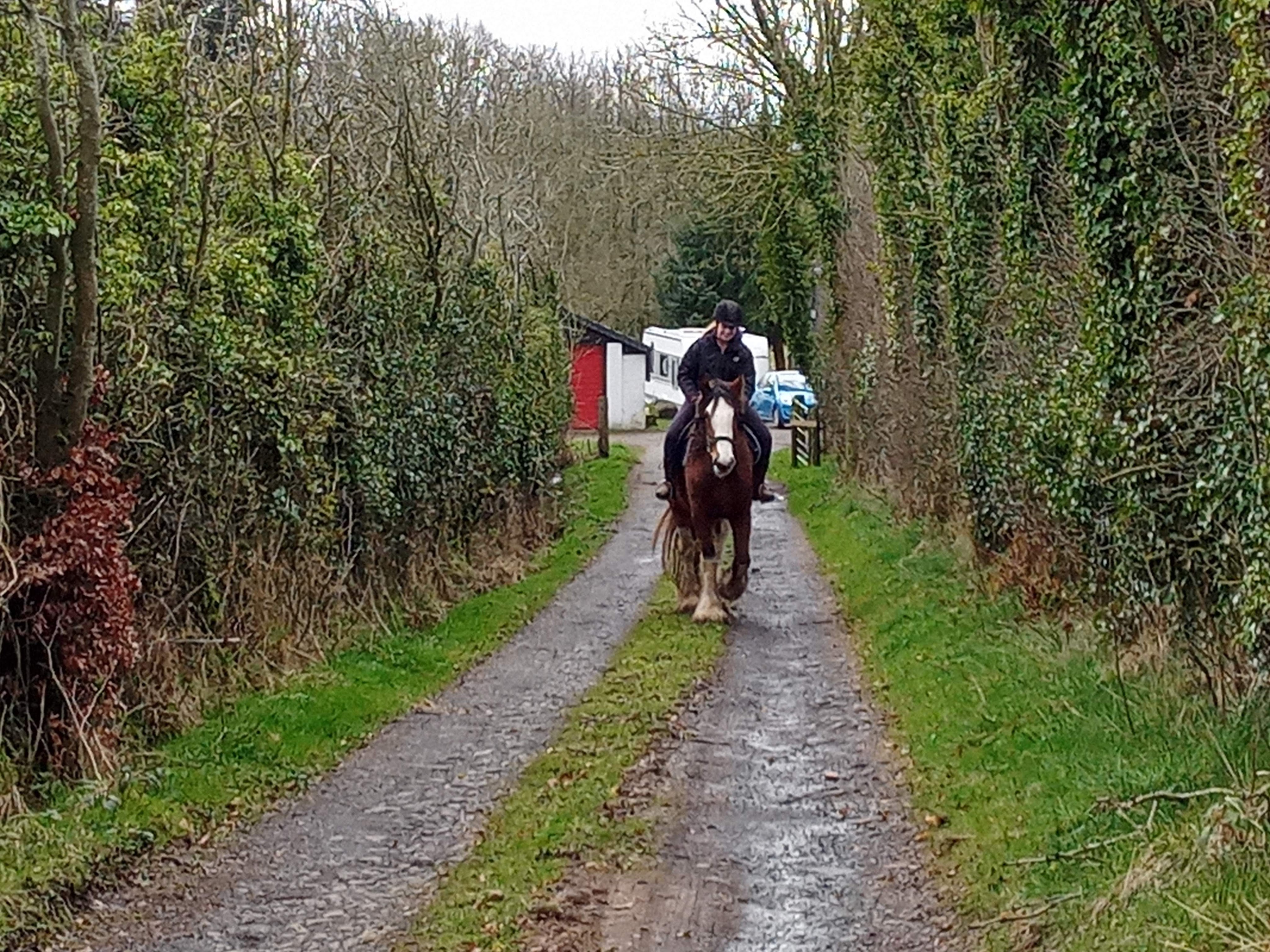 Recently we hired a lovely trainer for Dora to help us educate her. Within 3 weeks, DLT (Dora’s Lovely Trainer) was sitting on her and walking quietly up and down the lane. We were delighted with progress and Dora got lots of treats.