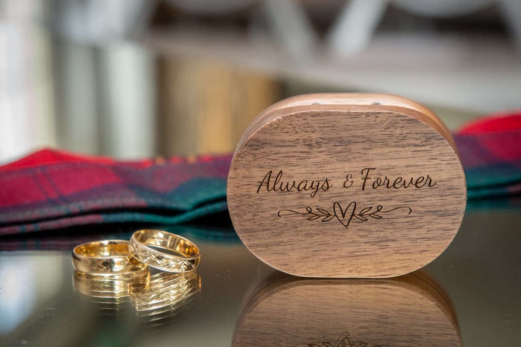 The rings with our handfasting ties in the background.