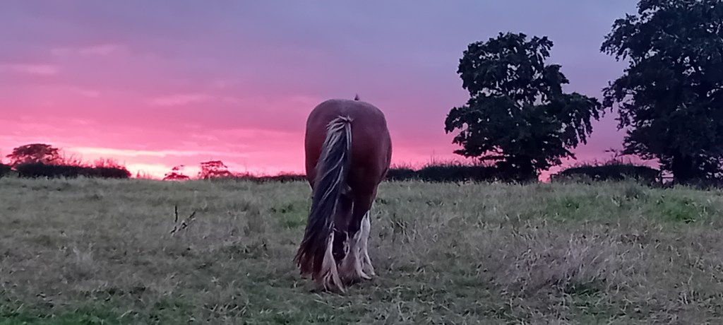 Day 4. Our lovely horse trainer came to help develop Dora’s stable manners. I’m to work on being boring and not handing out cuddles every time Dora looks for attention. She’s to get praise and cuddles when she does what is requested of her. We worked on backing up in the stable, moving over, standing still, and getting her tail brushed out. We also trimmed her tail as it was so long it dragged on the ground. She could pull something if it was under her and she tried to get up. Also, I was getting fed up untangling the roots, branches, jaggy bits, etc that got caught in her tail as she walks about the field.